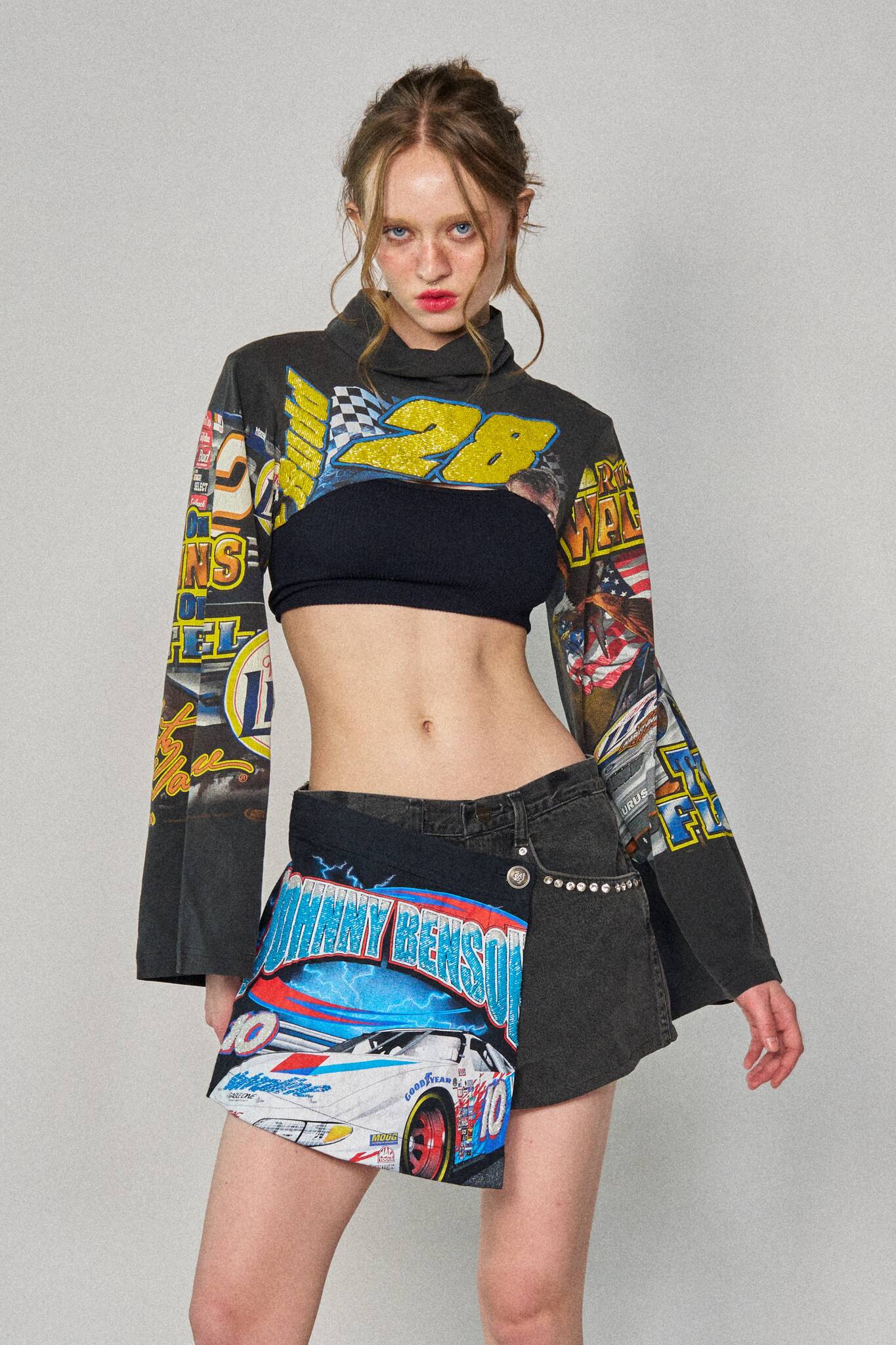 Deconstructed shorts in washed black denim with an asymmetric wrap from upcycled racing tees. Finished off faux diamond stud liners at the front pockets.