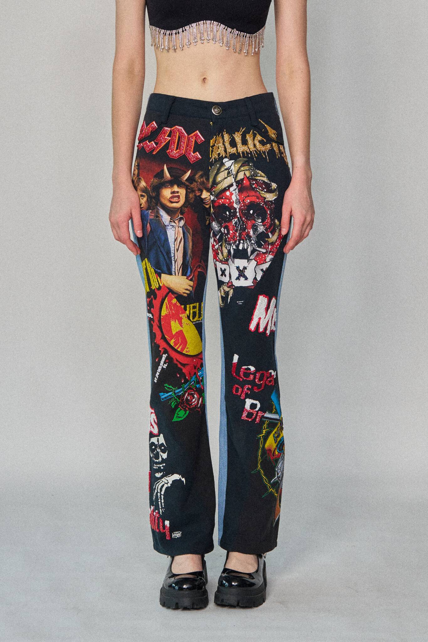 Classic denim stitched with reworked band tees and sequin embellishments. Every pair is one of a kind.